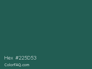 Hex #225d53 Color is a dark cyan color and the nearest color is Spectra #2f5a57. Hex code #225d53 and RGB value is rgb(34,93,83). In RGB color space, this color is composed of 13% red, 36% green, 33% blue, In CMYK color space, this color is composed of 63% cyan, 0% magenta, 11% yellow , 64% black , In HSL color space, this color has a hue angle of 170° , 46% saturation and 25% lightness.