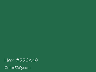 Hex #226a49 Color is a dark green color and the nearest color is Green Pea #1d6142. Hex code #226a49 and RGB value is rgb(34,106,73). In RGB color space, this color is composed of 13% red, 42% green, 29% blue, In CMYK color space, this color is composed of 68% cyan, 0% magenta, 31% yellow , 58% black , In HSL color space, this color has a hue angle of 153° , 51% saturation and 27% lightness.