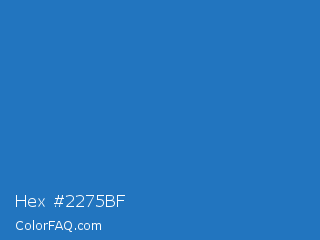 Hex #2275bf Color is a normal blue color and the nearest color is Mariner #286acd. Hex code #2275bf and RGB value is rgb(34,117,191). In RGB color space, this color is composed of 13% red, 46% green, 75% blue, In CMYK color space, this color is composed of 82% cyan, 39% magenta, 0% yellow , 25% black , In HSL color space, this color has a hue angle of 208° , 70% saturation and 44% lightness.