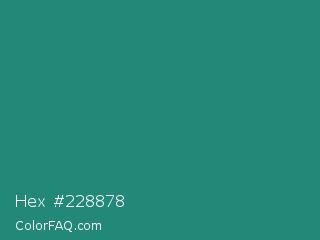 Hex #228878 Color is a normal cyan color and the nearest color is Celadon Green #2f847c. Hex code #228878 and RGB value is rgb(34,136,120). In RGB color space, this color is composed of 13% red, 53% green, 47% blue, In CMYK color space, this color is composed of 75% cyan, 0% magenta, 12% yellow , 47% black , In HSL color space, this color has a hue angle of 171° , 60% saturation and 33% lightness.