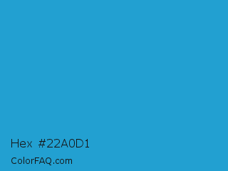 Hex #22a0d1 Color is a normal blue color and the nearest color is Curious Blue #2596d1. Hex code #22a0d1 and RGB value is rgb(34,160,209). In RGB color space, this color is composed of 13% red, 63% green, 82% blue, In CMYK color space, this color is composed of 84% cyan, 23% magenta, 0% yellow , 18% black , In HSL color space, this color has a hue angle of 197° , 72% saturation and 48% lightness.