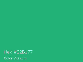 Hex #22b177 Color is a normal green color and the nearest color is Green Crayola #1cac78. Hex code #22b177 and RGB value is rgb(34,177,119). In RGB color space, this color is composed of 13% red, 69% green, 47% blue, In CMYK color space, this color is composed of 81% cyan, 0% magenta, 33% yellow , 31% black , In HSL color space, this color has a hue angle of 156° , 68% saturation and 41% lightness.