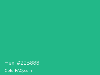 Hex #22b888 Color is a normal green color and the nearest color is Mountain Meadow Crayola #1ab385. Hex code #22b888 and RGB value is rgb(34,184,136). In RGB color space, this color is composed of 13% red, 72% green, 53% blue, In CMYK color space, this color is composed of 82% cyan, 0% magenta, 26% yellow , 28% black , In HSL color space, this color has a hue angle of 161° , 69% saturation and 43% lightness.