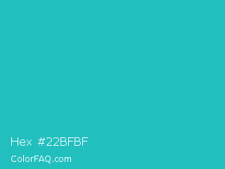 Hex #22bfbf Color is a normal cyan color and the nearest color is Java #1fc2c2. Hex code #22bfbf and RGB value is rgb(34,191,191). In RGB color space, this color is composed of 13% red, 75% green, 75% blue, In CMYK color space, this color is composed of 82% cyan, 0% magenta, 0% yellow , 25% black , In HSL color space, this color has a hue angle of 180° , 70% saturation and 44% lightness.
