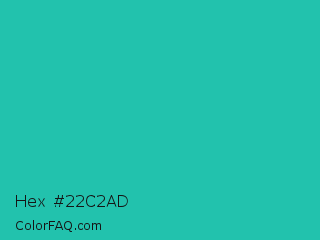 Hex #22c2ad Color is a normal cyan color and the nearest color is Light Sea Green #20b2aa. Hex code #22c2ad and RGB value is rgb(34,194,173). In RGB color space, this color is composed of 13% red, 76% green, 68% blue, In CMYK color space, this color is composed of 82% cyan, 0% magenta, 11% yellow , 24% black , In HSL color space, this color has a hue angle of 172° , 70% saturation and 45% lightness.