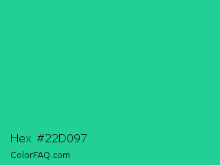Hex #22d097 Color is a normal green color and the nearest color is Shamrock #33cc99. Hex code #22d097 and RGB value is rgb(34,208,151). In RGB color space, this color is composed of 13% red, 82% green, 59% blue, In CMYK color space, this color is composed of 84% cyan, 0% magenta, 27% yellow , 18% black , In HSL color space, this color has a hue angle of 160° , 72% saturation and 47% lightness.
