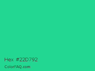 Hex #22d792 Color is a normal green color and the nearest color is Shamrock #33cc99. Hex code #22d792 and RGB value is rgb(34,215,146). In RGB color space, this color is composed of 13% red, 84% green, 57% blue, In CMYK color space, this color is composed of 84% cyan, 0% magenta, 32% yellow , 16% black , In HSL color space, this color has a hue angle of 157° , 73% saturation and 49% lightness.