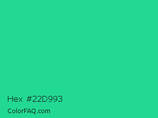 Hex #22d993 Color is a normal green color and the nearest color is Shamrock #33cc99. Hex code #22d993 and RGB value is rgb(34,217,147). In RGB color space, this color is composed of 13% red, 85% green, 58% blue, In CMYK color space, this color is composed of 84% cyan, 0% magenta, 32% yellow , 15% black , In HSL color space, this color has a hue angle of 157° , 73% saturation and 49% lightness.