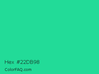 Hex #22db98 Color is a normal green color and the nearest color is Shamrock #33cc99. Hex code #22db98 and RGB value is rgb(34,219,152). In RGB color space, this color is composed of 13% red, 86% green, 60% blue, In CMYK color space, this color is composed of 84% cyan, 0% magenta, 31% yellow , 14% black , In HSL color space, this color has a hue angle of 158° , 73% saturation and 50% lightness.