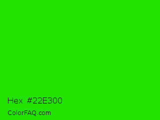 Hex #22e300 Color is a normal green color and the nearest color is Harlequin #3fff00. Hex code #22e300 and RGB value is rgb(34,227,0). In RGB color space, this color is composed of 13% red, 89% green, 0% blue, In CMYK color space, this color is composed of 85% cyan, 0% magenta, 100% yellow , 11% black , In HSL color space, this color has a hue angle of 111° , 100% saturation and 45% lightness.