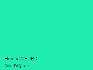 Hex #22edb0 Color is a normal green color and the nearest color is Turquoise PWG #30d5c8. Hex code #22edb0 and RGB value is rgb(34,237,176). In RGB color space, this color is composed of 13% red, 93% green, 69% blue, In CMYK color space, this color is composed of 86% cyan, 0% magenta, 26% yellow , 7% black , In HSL color space, this color has a hue angle of 162° , 85% saturation and 53% lightness.