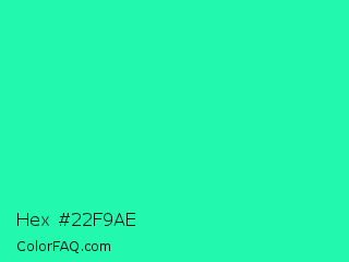 Hex #22f9ae Color is a normal green color and the nearest color is Medium Spring Green #00fa9a. Hex code #22f9ae and RGB value is rgb(34,249,174). In RGB color space, this color is composed of 13% red, 98% green, 68% blue, In CMYK color space, this color is composed of 86% cyan, 0% magenta, 30% yellow , 2% black , In HSL color space, this color has a hue angle of 159° , 95% saturation and 55% lightness.