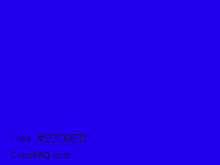 Hex #2300ed Color is a normal indigo color and the nearest color is Bluebonnet #1c1cf0. Hex code #2300ed and RGB value is rgb(35,0,237). In RGB color space, this color is composed of 14% red, 0% green, 93% blue, In CMYK color space, this color is composed of 85% cyan, 100% magenta, 0% yellow , 7% black , In HSL color space, this color has a hue angle of 249° , 100% saturation and 46% lightness.