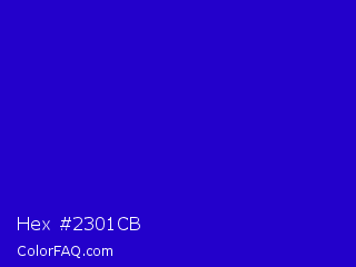Hex #2301cb Color is a normal indigo color and the nearest color is Interdimensional Blue #360ccc. Hex code #2301cb and RGB value is rgb(35,1,203). In RGB color space, this color is composed of 14% red, 0% green, 80% blue, In CMYK color space, this color is composed of 83% cyan, 100% magenta, 0% yellow , 20% black , In HSL color space, this color has a hue angle of 250° , 99% saturation and 40% lightness.