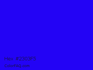 Hex #2303f5 Color is a normal indigo color and the nearest color is Bluebonnet #1c1cf0. Hex code #2303f5 and RGB value is rgb(35,3,245). In RGB color space, this color is composed of 14% red, 1% green, 96% blue, In CMYK color space, this color is composed of 86% cyan, 99% magenta, 0% yellow , 4% black , In HSL color space, this color has a hue angle of 248° , 98% saturation and 49% lightness.