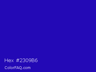 Hex #2309b6 Color is a normal indigo color and the nearest color is Interdimensional Blue #360ccc. Hex code #2309b6 and RGB value is rgb(35,9,182). In RGB color space, this color is composed of 14% red, 4% green, 71% blue, In CMYK color space, this color is composed of 81% cyan, 95% magenta, 0% yellow , 29% black , In HSL color space, this color has a hue angle of 249° , 91% saturation and 37% lightness.