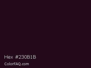 Hex #230b1b Color is a almost black magenta color and the nearest color is Gondola #261414. Hex code #230b1b and RGB value is rgb(35,11,27). In RGB color space, this color is composed of 14% red, 4% green, 11% blue, In CMYK color space, this color is composed of 0% cyan, 69% magenta, 23% yellow , 86% black , In HSL color space, this color has a hue angle of 320° , 52% saturation and 9% lightness.