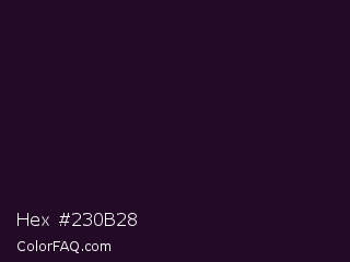 Hex #230b28 Color is a very dark purple color and the nearest color is Jacaranda #2e0329. Hex code #230b28 and RGB value is rgb(35,11,40). In RGB color space, this color is composed of 14% red, 4% green, 16% blue, In CMYK color space, this color is composed of 13% cyan, 73% magenta, 0% yellow , 84% black , In HSL color space, this color has a hue angle of 290° , 57% saturation and 10% lightness.