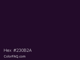 Hex #230b2a Color is a very dark purple color and the nearest color is Jacaranda #2e0329. Hex code #230b2a and RGB value is rgb(35,11,42). In RGB color space, this color is composed of 14% red, 4% green, 16% blue, In CMYK color space, this color is composed of 17% cyan, 74% magenta, 0% yellow , 84% black , In HSL color space, this color has a hue angle of 286° , 58% saturation and 10% lightness.