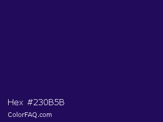 Hex #230b5b Color is a very dark indigo color and the nearest color is Violent Violet #290c5e. Hex code #230b5b and RGB value is rgb(35,11,91). In RGB color space, this color is composed of 14% red, 4% green, 36% blue, In CMYK color space, this color is composed of 62% cyan, 88% magenta, 0% yellow , 64% black , In HSL color space, this color has a hue angle of 258° , 78% saturation and 20% lightness.