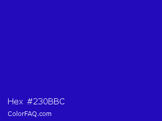 Hex #230bbc Color is a normal indigo color and the nearest color is Interdimensional Blue #360ccc. Hex code #230bbc and RGB value is rgb(35,11,188). In RGB color space, this color is composed of 14% red, 4% green, 74% blue, In CMYK color space, this color is composed of 81% cyan, 94% magenta, 0% yellow , 26% black , In HSL color space, this color has a hue angle of 248° , 89% saturation and 39% lightness.