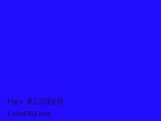 Hex #230bfb Color is a normal indigo color and the nearest color is Bluebonnet #1c1cf0. Hex code #230bfb and RGB value is rgb(35,11,251). In RGB color space, this color is composed of 14% red, 4% green, 98% blue, In CMYK color space, this color is composed of 86% cyan, 96% magenta, 0% yellow , 2% black , In HSL color space, this color has a hue angle of 246° , 97% saturation and 51% lightness.