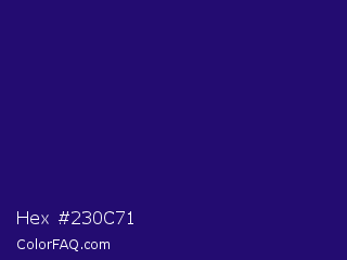 Hex #230c71 Color is a dark indigo color and the nearest color is Deep Blue #220878. Hex code #230c71 and RGB value is rgb(35,12,113). In RGB color space, this color is composed of 14% red, 5% green, 44% blue, In CMYK color space, this color is composed of 69% cyan, 89% magenta, 0% yellow , 56% black , In HSL color space, this color has a hue angle of 254° , 81% saturation and 25% lightness.
