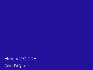 Hex #23109b Color is a normal indigo color and the nearest color is Blue Gem #2c0e8c. Hex code #23109b and RGB value is rgb(35,16,155). In RGB color space, this color is composed of 14% red, 6% green, 61% blue, In CMYK color space, this color is composed of 77% cyan, 90% magenta, 0% yellow , 39% black , In HSL color space, this color has a hue angle of 248° , 81% saturation and 34% lightness.