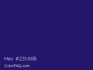 Hex #23166b Color is a dark indigo color and the nearest color is Lucky Point #1a1a68. Hex code #23166b and RGB value is rgb(35,22,107). In RGB color space, this color is composed of 14% red, 9% green, 42% blue, In CMYK color space, this color is composed of 67% cyan, 79% magenta, 0% yellow , 58% black , In HSL color space, this color has a hue angle of 249° , 66% saturation and 25% lightness.