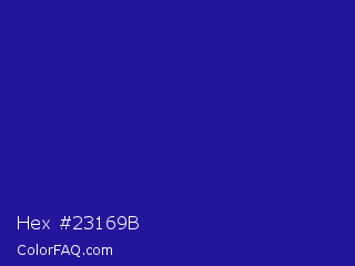 Hex #23169b Color is a normal indigo color and the nearest color is Jacksons Purple #20208d. Hex code #23169b and RGB value is rgb(35,22,155). In RGB color space, this color is composed of 14% red, 9% green, 61% blue, In CMYK color space, this color is composed of 77% cyan, 86% magenta, 0% yellow , 39% black , In HSL color space, this color has a hue angle of 246° , 75% saturation and 35% lightness.