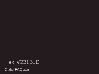 Hex #231b1d Color is a very dark red color and the nearest color is Eerie Black #1b1b1b. Hex code #231b1d and RGB value is rgb(35,27,29). In RGB color space, this color is composed of 14% red, 11% green, 11% blue, In CMYK color space, this color is composed of 0% cyan, 23% magenta, 17% yellow , 86% black , In HSL color space, this color has a hue angle of 345° , 13% saturation and 12% lightness.