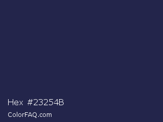 Hex #23254b Color is a very dark blue color and the nearest color is Port Gore #251f4f. Hex code #23254b and RGB value is rgb(35,37,75). In RGB color space, this color is composed of 14% red, 15% green, 29% blue, In CMYK color space, this color is composed of 53% cyan, 51% magenta, 0% yellow , 71% black , In HSL color space, this color has a hue angle of 237° , 36% saturation and 22% lightness.
