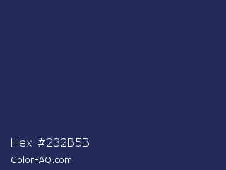 Hex #232b5b Color is a dark blue color and the nearest color is Cloud Burst #202e54. Hex code #232b5b and RGB value is rgb(35,43,91). In RGB color space, this color is composed of 14% red, 17% green, 36% blue, In CMYK color space, this color is composed of 62% cyan, 53% magenta, 0% yellow , 64% black , In HSL color space, this color has a hue angle of 231° , 44% saturation and 25% lightness.