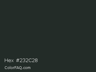 Hex #232c28 Color is a very dark green color and the nearest color is Charleston Green #232b2b. Hex code #232c28 and RGB value is rgb(35,44,40). In RGB color space, this color is composed of 14% red, 17% green, 16% blue, In CMYK color space, this color is composed of 20% cyan, 0% magenta, 9% yellow , 83% black , In HSL color space, this color has a hue angle of 153° , 11% saturation and 15% lightness.