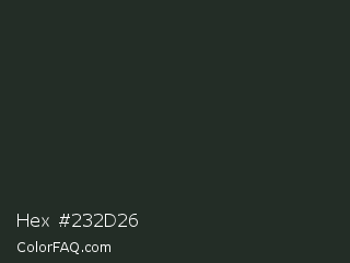 Hex #232d26 Color is a very dark green color and the nearest color is Charleston Green #232b2b. Hex code #232d26 and RGB value is rgb(35,45,38). In RGB color space, this color is composed of 14% red, 18% green, 15% blue, In CMYK color space, this color is composed of 22% cyan, 0% magenta, 16% yellow , 82% black , In HSL color space, this color has a hue angle of 138° , 13% saturation and 16% lightness.