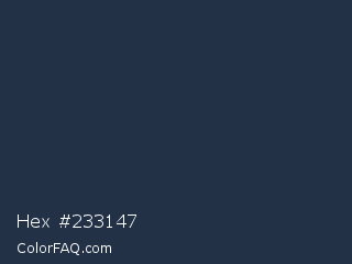 Hex #233147 Color is a very dark blue color and the nearest color is Yankees Blue #1c2841. Hex code #233147 and RGB value is rgb(35,49,71). In RGB color space, this color is composed of 14% red, 19% green, 28% blue, In CMYK color space, this color is composed of 51% cyan, 31% magenta, 0% yellow , 72% black , In HSL color space, this color has a hue angle of 217° , 34% saturation and 21% lightness.