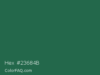 Hex #23684b Color is a dark green color and the nearest color is Green Pea #1d6142. Hex code #23684b and RGB value is rgb(35,104,75). In RGB color space, this color is composed of 14% red, 41% green, 29% blue, In CMYK color space, this color is composed of 66% cyan, 0% magenta, 28% yellow , 59% black , In HSL color space, this color has a hue angle of 155° , 50% saturation and 27% lightness.
