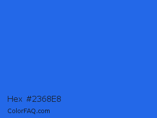 Hex #2368e8 Color is a normal blue color and the nearest color is Blue Crayola #1f75fe. Hex code #2368e8 and RGB value is rgb(35,104,232). In RGB color space, this color is composed of 14% red, 41% green, 91% blue, In CMYK color space, this color is composed of 85% cyan, 55% magenta, 0% yellow , 9% black , In HSL color space, this color has a hue angle of 219° , 81% saturation and 52% lightness.