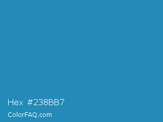 Hex #238bb7 Color is a normal blue color and the nearest color is Cyan Cornflower Blue #188bc2. Hex code #238bb7 and RGB value is rgb(35,139,183). In RGB color space, this color is composed of 14% red, 55% green, 72% blue, In CMYK color space, this color is composed of 81% cyan, 24% magenta, 0% yellow , 28% black , In HSL color space, this color has a hue angle of 198° , 68% saturation and 43% lightness.