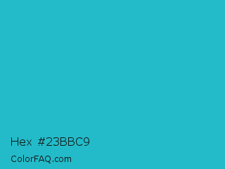 Hex #23bbc9 Color is a normal cyan color and the nearest color is Java #1fc2c2. Hex code #23bbc9 and RGB value is rgb(35,187,201). In RGB color space, this color is composed of 14% red, 73% green, 79% blue, In CMYK color space, this color is composed of 83% cyan, 7% magenta, 0% yellow , 21% black , In HSL color space, this color has a hue angle of 185° , 70% saturation and 46% lightness.