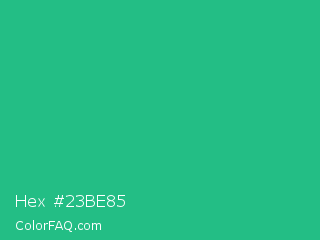 Hex #23be85 Color is a normal green color and the nearest color is Mountain Meadow Crayola #1ab385. Hex code #23be85 and RGB value is rgb(35,190,133). In RGB color space, this color is composed of 14% red, 75% green, 52% blue, In CMYK color space, this color is composed of 82% cyan, 0% magenta, 30% yellow , 25% black , In HSL color space, this color has a hue angle of 158° , 69% saturation and 44% lightness.