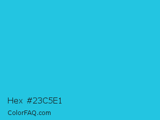 Hex #23c5e1 Color is a normal cyan color and the nearest color is Scooter #2ebfd4. Hex code #23c5e1 and RGB value is rgb(35,197,225). In RGB color space, this color is composed of 14% red, 77% green, 88% blue, In CMYK color space, this color is composed of 84% cyan, 12% magenta, 0% yellow , 12% black , In HSL color space, this color has a hue angle of 189° , 76% saturation and 51% lightness.