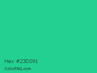 Hex #23d091 Color is a normal green color and the nearest color is Shamrock #33cc99. Hex code #23d091 and RGB value is rgb(35,208,145). In RGB color space, this color is composed of 14% red, 82% green, 57% blue, In CMYK color space, this color is composed of 83% cyan, 0% magenta, 30% yellow , 18% black , In HSL color space, this color has a hue angle of 158° , 71% saturation and 48% lightness.