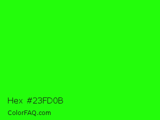 Hex #23fd0b Color is a normal green color and the nearest color is Neon Green #39ff14. Hex code #23fd0b and RGB value is rgb(35,253,11). In RGB color space, this color is composed of 14% red, 99% green, 4% blue, In CMYK color space, this color is composed of 86% cyan, 0% magenta, 96% yellow , 1% black , In HSL color space, this color has a hue angle of 114° , 98% saturation and 52% lightness.