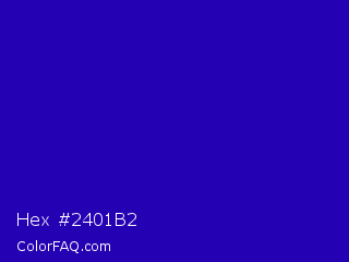Hex #2401b2 Color is a normal indigo color and the nearest color is Interdimensional Blue #360ccc. Hex code #2401b2 and RGB value is rgb(36,1,178). In RGB color space, this color is composed of 14% red, 0% green, 70% blue, In CMYK color space, this color is composed of 80% cyan, 99% magenta, 0% yellow , 30% black , In HSL color space, this color has a hue angle of 252° , 99% saturation and 35% lightness.