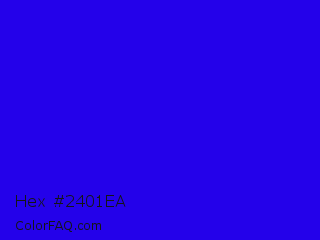 Hex #2401ea Color is a normal indigo color and the nearest color is Bluebonnet #1c1cf0. Hex code #2401ea and RGB value is rgb(36,1,234). In RGB color space, this color is composed of 14% red, 0% green, 92% blue, In CMYK color space, this color is composed of 85% cyan, 100% magenta, 0% yellow , 8% black , In HSL color space, this color has a hue angle of 249° , 99% saturation and 46% lightness.