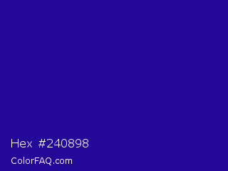 Hex #240898 Color is a normal indigo color and the nearest color is Blue Gem #2c0e8c. Hex code #240898 and RGB value is rgb(36,8,152). In RGB color space, this color is composed of 14% red, 3% green, 60% blue, In CMYK color space, this color is composed of 76% cyan, 95% magenta, 0% yellow , 40% black , In HSL color space, this color has a hue angle of 252° , 90% saturation and 31% lightness.