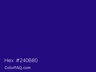 Hex #240b80 Color is a dark indigo color and the nearest color is Deep Blue #220878. Hex code #240b80 and RGB value is rgb(36,11,128). In RGB color space, this color is composed of 14% red, 4% green, 50% blue, In CMYK color space, this color is composed of 72% cyan, 91% magenta, 0% yellow , 50% black , In HSL color space, this color has a hue angle of 253° , 84% saturation and 27% lightness.
