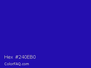Hex #240eb0 Color is a normal indigo color and the nearest color is Interdimensional Blue #360ccc. Hex code #240eb0 and RGB value is rgb(36,14,176). In RGB color space, this color is composed of 14% red, 5% green, 69% blue, In CMYK color space, this color is composed of 80% cyan, 92% magenta, 0% yellow , 31% black , In HSL color space, this color has a hue angle of 248° , 85% saturation and 37% lightness.