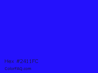 Hex #2411fc Color is a normal indigo color and the nearest color is Bluebonnet #1c1cf0. Hex code #2411fc and RGB value is rgb(36,17,252). In RGB color space, this color is composed of 14% red, 7% green, 99% blue, In CMYK color space, this color is composed of 86% cyan, 93% magenta, 0% yellow , 1% black , In HSL color space, this color has a hue angle of 245° , 98% saturation and 53% lightness.